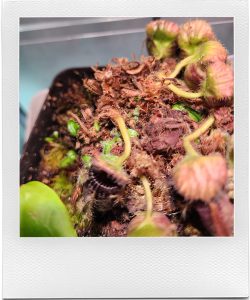 The root system of the Cephalotus is quite deep so you should be careful when repotting. Also, I avoid repotting, as this sets back the plant quite a bit and sometimes the plant doesn’t make it. I have noticed that even pulling the dead pitchers, which fall off pretty easily, then sets back the hole plant and suddenly many more pitchers got black too after I’ve pulled a few of the dead ones. This is very odd, but i had this happen multiple times. Below you can see the aftermath of my reckless plucking of old, dead growth.. you can see how the whole top and left part of the plant just died. New growth is emerging but it will take quite some time until i get it to look as beautiful as it was.